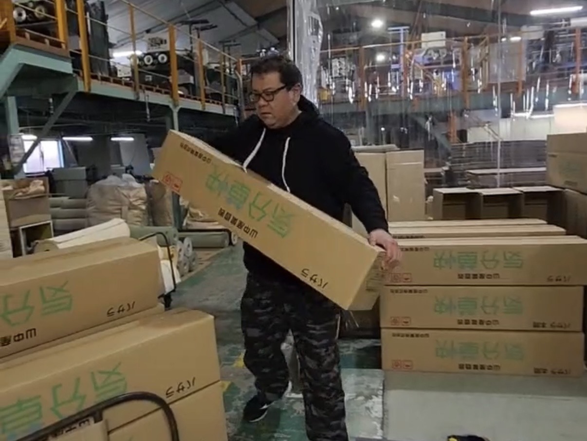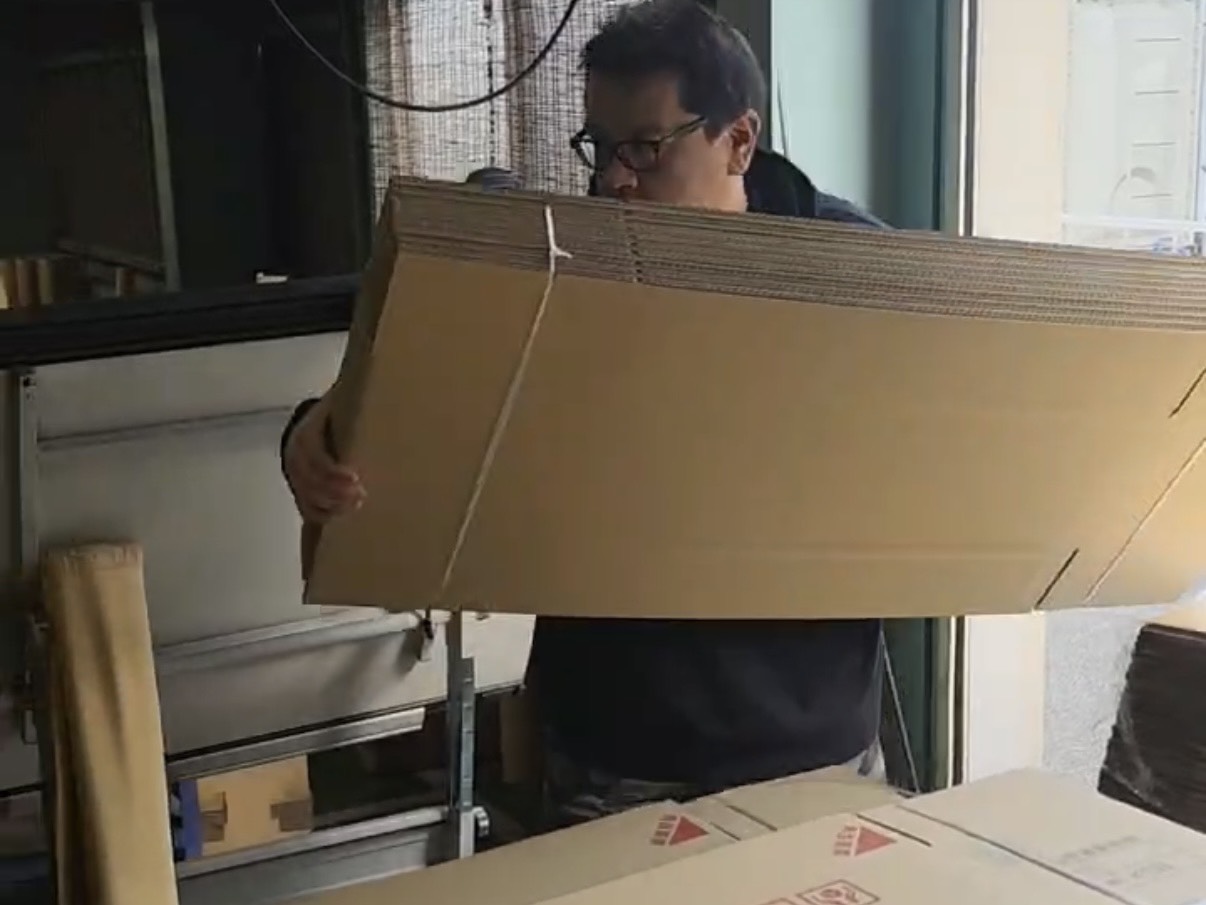 完成した畳を保護するための大きなダンボールを、必要なタイミングで検品台まで運びます。