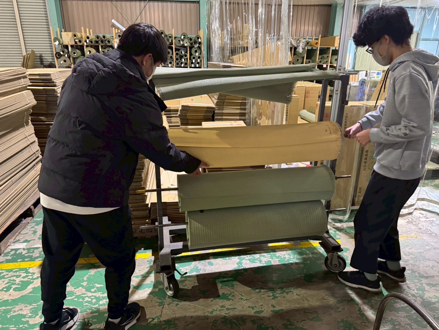 10帖分に巻き上げられた畳表は、想像以上の重量があります。これを熱処理の機械まで台車で運ぶのですが、1人ではバランスを崩しやすく、危険も伴います。