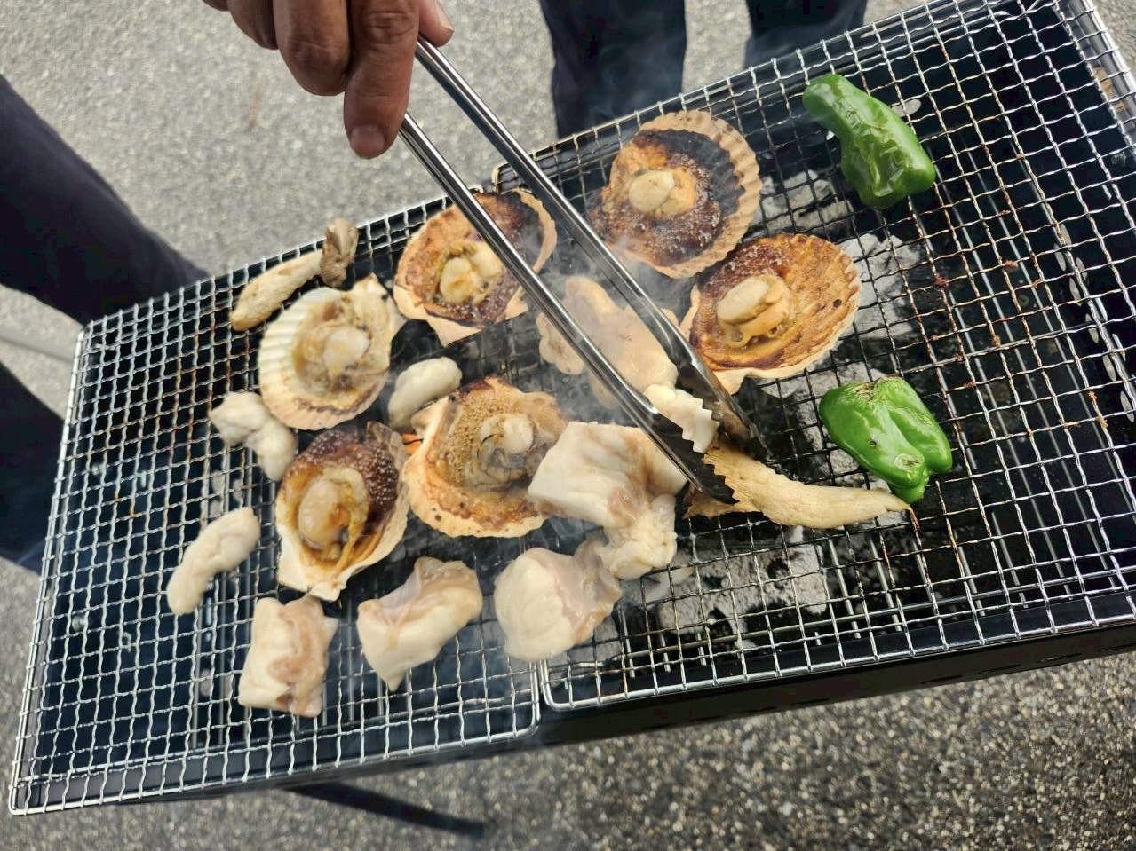 なんと、ホタテ、エビ、イカ、サザエといった新鮮な海の幸が勢揃い!磯の香りが漂い、網の上でジュウジュウと焼ける様は、まさに贅沢の極み。さらに、スパムや旬のトウモロコシなど、バラエティ豊かな食材も加わり、テーブルの上はさながら夢のビュッフェとなりました。